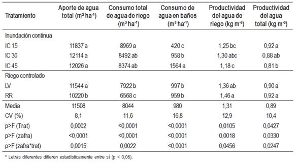 El aporte de agua total promedio de las tres zafras fue de 11508 m3 ha-1 de los cuales 8044 m3 ha-1 correspondieron al riego. Estas cifras coinciden con los valores reportados para estas condiciones donde se estima necesidades de agua (para manejos del riego convencionales -IC 30) entre 11000 a 14000 m3 ha-1 (ACA et al., 2009), ya que el aporte de las precipitaciones puede ser muy variable. Del consumo total del agua de riego el correspondiente a baños significó un 12 % (980 m3 ha-1). Los tratamientos de inundación continua más temprana y más tardía son los que registraron las mayores diferencias en el volumen de agua utilizado en baños. Esto concuerda con los valores reportados por Roel (1999), quien estimó un volumen de agua promedio para baños de 372 m3 ha-1 y 1753 m3 ha-1 para los tratamientos IC15 e IC45 respectivamente.