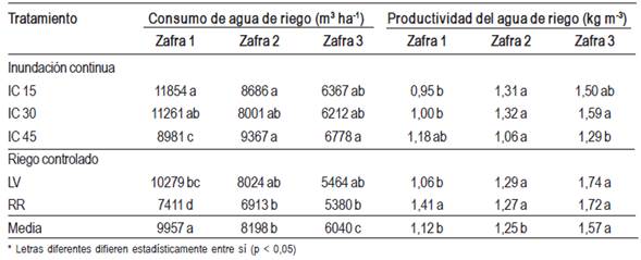 La existencia de una interacción significativa del efecto de los tratamientos con la zafra, tanto en consumo como productividad del agua de riego, determina la no existencia generalizada de un patrón de comportamientos a lo largo de las tres zafras. No obstante esto, se pueden visualizar algunas tendencias.