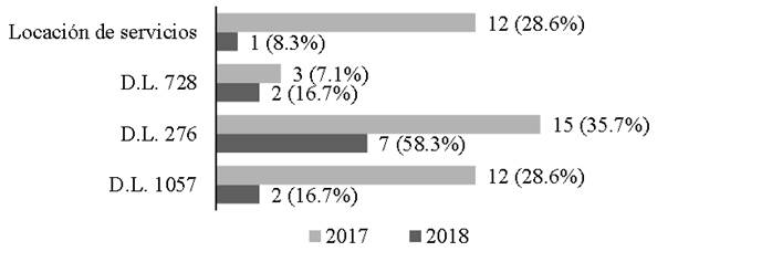 En 2017 y 2018, solo el 7.1 % y 16.7 %, respectivamente, de los contratos se encuentran regulados por el régimen que según ley corresponde a un TOM; es decir el D. L. 728 (Figura 1). En ambos años de análisis, la mayor proporción de contratos estuvo regulada por el régimen laboral del D. L. 276 o régimen público.