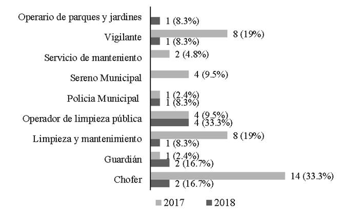 En 2017 y 2018, solo el 2.4 % y el 8.3 %, respectivamente, fueron contratos de policía municipal, guardián y limpieza y mantenimiento (Figura 2).