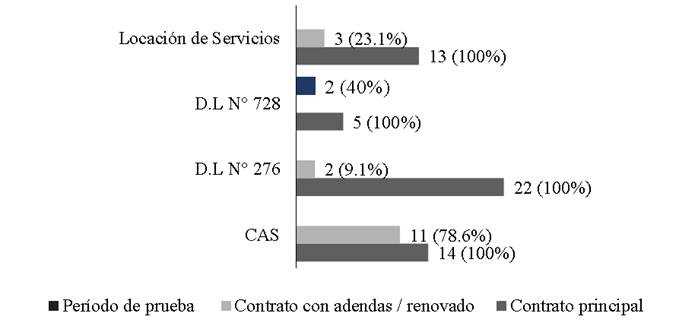 En la modalidad del D. L. 728 el 40 % de los contratos se han referido a un tiempo de prueba que corresponde a un año. En la modalidad CAS, el 78.6 % ha tenido al menos una adenda. En la modalidad del D. L. 276, el 9.1 % ha tenido al menos una renovación. Por locación de servicios, el 23.1 % ha tenido al menos una renovación (Figura 3).