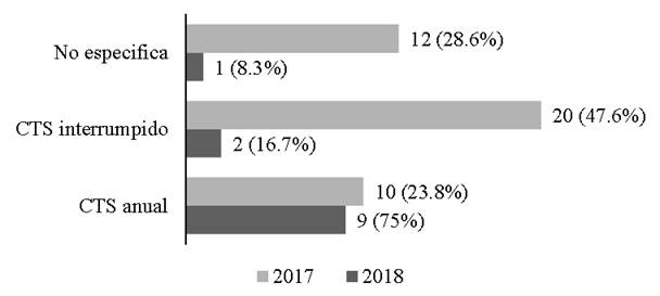 En 2017, el 47.6 % de los trabajadores recibió el depósito de CTS; sin embargo, por la contratación interrumpida de estos, no se depositaron completos, el 28.6 % no especifica el depósito de CTS y el 23.8 % han recibido los depósitos conforme a la ley. En 2018, el 75 % recibió los depósitos conforme a la ley, el 16.7 % recibió el depósito de CTS interrumpido y el 8.3 % no especifica (Figura 4).