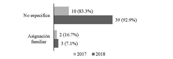 En 2017, el 83.3 % de los contratos no especifica si se otorga o no una asignación familiar y el 16.7 % sí dispone una conforme a la ley. En 2018, el 92.9 % no especifica una asignación familiar y el 7.1 % dispone una conforme a ley (Figura 5).