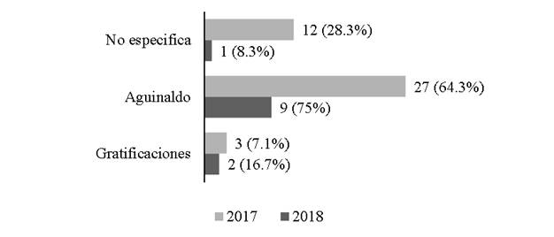 En 2017, el 64.3 % de los contratos regula el depósito de aguinaldos, el 28.3 % no especifica depósitos y el 7.1 % regula el depósito de gratificaciones; es decir, dos gratificaciones al año, una en julio, por concepto de fiestas patrias, y otra en diciembre, por fiestas navideñas. En 2018, el 75 % regula depósitos de aguinaldos, el 16.7 % regula el depósito de gratificaciones y el 8.3 % no especifica (Figura 6).