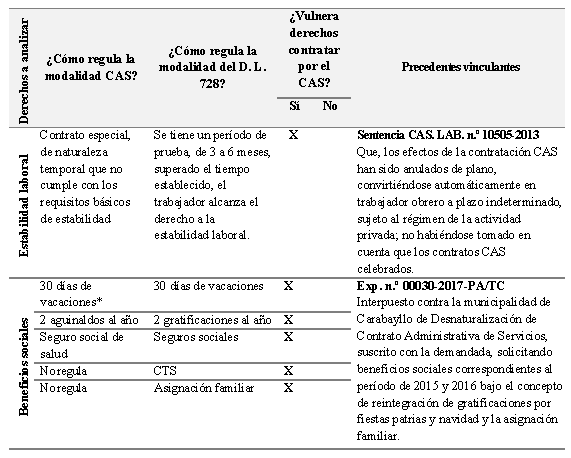 En ese sentido, en la Tabla 1 analiza la contratación de los obreros en la MPCh, 2017 y 2018, bajo la modalidad de contratación administrativa de servicios o también conocida como CAS. Se identificó como derechos vulnerados la estabilidad laboral y el pago de algunos beneficios sociales, como son las gratificaciones, compensación por tiempo de servicios (CTS) y asignación familiar.