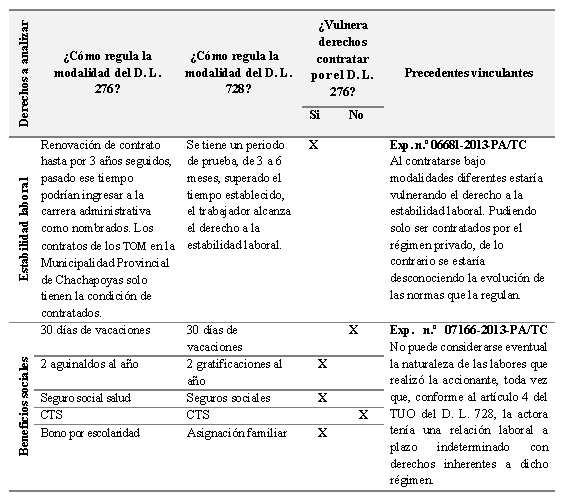 En este apartado corresponde analizar los contratos de TOM suscritos con la MPCh durante los años 2017 y 2018. Los resultados obtenidos en el apartado precedente ahora se plasmarán en tablas para ser comparados. Para entender mejor las tablas mostradas subsiguientemente, se señala que: en la columna 1 se ubican los derechos a analizar; en la columna 2 se desarrolla la modalidad por la que el obrero fue contratado en la MPCh, pudiendo ser por D. L 1057, D. L. 276 o inclusive por la figura de locación de servicios; en la columna 3 se ubica la modalidad que le corresponde a un obrero, que es el D. L. 728; en la columna 4 se determina la vulneración de derechos laborales, teniendo en cuenta los derechos laborales otorgados bajo la modalidad contratada en la MPCh (D. L. 1057, D. L. 276 o inclusive la figura de locación de servicios) y los derechos laborales otorgados bajo la modalidad que efectivamente le corresponde a un obrero según la ley; en la columna 5 se avaló los resultados mediante la jurisprudencia y casos concretos.