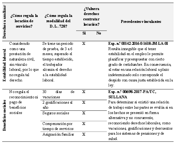 La Tabla 3 muestra que los derechos más vulnerados en la contratación por locación de servicios son la estabilidad y los beneficios sociales, como gratificaciones, compensación por tiempo de servicios y asignación familiar. Además, se debe tener en cuenta que en las cláusulas de los contratos se detalla que la figura de locación de servicios no genera vínculo laboral ni reconoce derechos laborales, sino más bien se encuentra comprendido y protegido por las normas del Código Civil, del cual emerge solo una relación de naturaleza civil, mas no laboral.