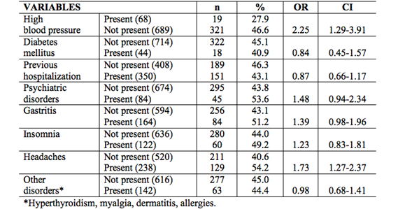 When non-prescription drug use was compared with the socio-demographic variables, there were no significant differences with: professional situation, where the non-medical professionals are 1.66 times more likely to take them; tobacco consumption, where those who smoke are 1.38 times more likely to take them; or alcohol consumption, where those who drink are 2.10 times more likely to take them. There are no significant differences with sex, ethnic group, marital status, residence, monthly income or economic problems (Table I). There was no significant association with the work variables: shift work, doing extra shifts, job satisfaction and their performance rating (Table II). No significant differences were found with the clinical variables: high blood pressure, where those who do not have hypertension are 2.25 times more likely to take them; clinical condition, where those who have some medical condition are 1.74 times more likely to take them; headaches, where those who have headaches are 1.73 times more likely to take them. There are no significant differences with diabetes mellitus, previous hospitalization, psychiatric disorders, gastritis, insomnia or other disorders (Table III).