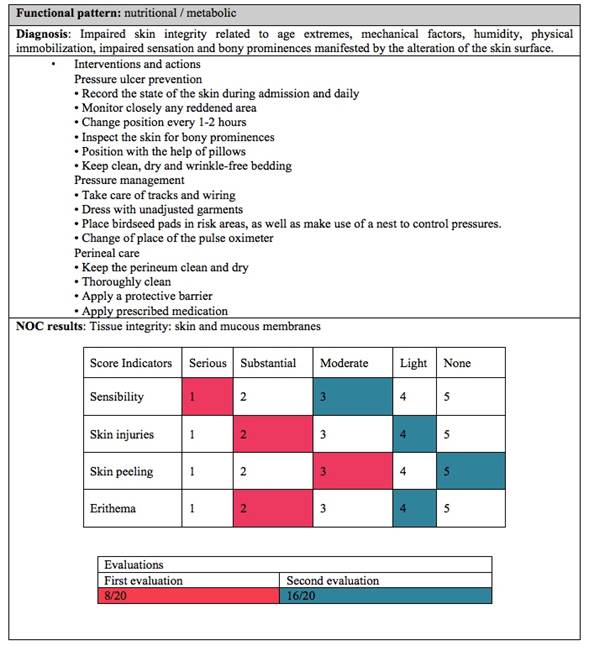 For the diagnosis of deterioration of skin integrity, a care intervention was planned focused on avoiding pressure injuries, as shown in Table 8. There was a highly positive evolution after the application of topical panthenol and miconazole in the genital area.