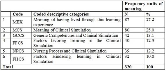 1. Experience of the students of the Nursing Career in relation to the Clinical Simulation: perception around the concept and experience as a learning strategy in their professional training in the Nursing Career (MEX - MCS). 2. Factors that facilitate and hinder learning with Clinical Simulation: appreciation in relation to aspects that contribute and hinder learning, related to aspects of students, teachers, supplies, infrastructure and organization of the activity (FFCS - FHCS). 3. Skills developed in nursing students, through Clinical Simulation: opinions linked to specific competencies within the nursing and generic processes (instrumental, systemic and interpersonal) (NPCS - GCCS).