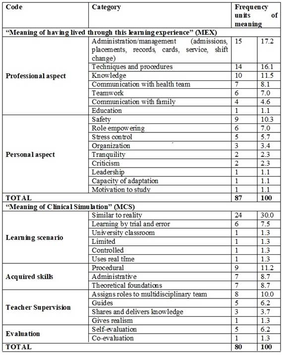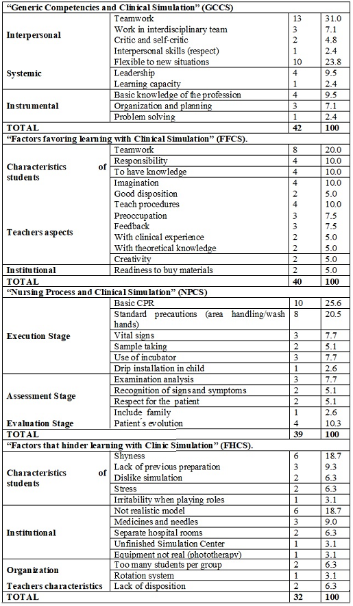 1. Contributions of nursing students to implement the Clinical Simulation: it represents the opinions in relation to the experience that allowed them to conceptualize it and identify concurrent factors in its application (MEX - MCS - FFCS - FHCS). 2. Contribution of the Clinical Simulation as a learning strategy for the development of disciplinary and generic competences for its future professional performance: it evidences the assessment regarding the development of the nursing process as disciplinary and generic competences (instrumental, systemic and interpersonal) (NPCS) - GCCS).