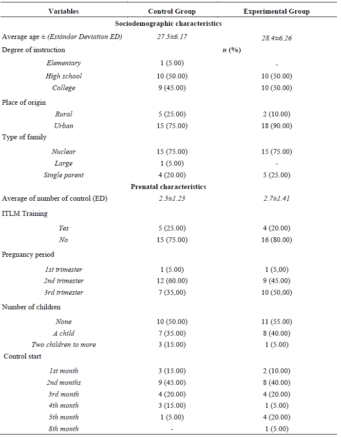 On the other hand, in the same Table 1, in the experimental group, in relation with the sociodemographic characteristics, the mean age of the pregnant women was 28.4 years, 50 % of the pregnant women had completed high school, 90 % were from urban areas, 75 % had a nuclear family. Regarding the prenatal characteristics of the experimental group, the average number of controls of the pregnant women was 2.7, 80 % did not receive training on the ITLM, 50 % were in the 3rd trimester of pregnancy, 55 % were first-time mothers and finally, 40 % started their prenatal controls in the second month of pregnancy.