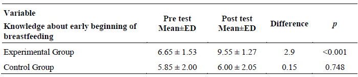 Houve um aumento no conhecimento após a intervenção educacional (p<0,05) e 83,33% das mulheres grávidas, que pertenciam ao grupo experimental, tiveram um início precoce de amamentação após a intervenção (p<0,001).