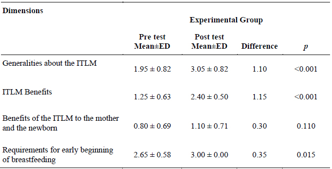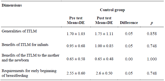 In Table 3 it can be observed in the experimental group, the general dimensions about the ITLM, benefits of the ITLM to the infant and requirements to start breastfeeding early, which were significant (p<0.05) where in the first dimension it increased from 1.95 to 3.05; the second dimension from 1.25 to 2.40 and the fourth dimension from 2.65 to 3.00 increased respectively.