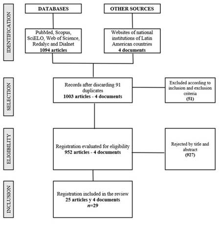 Descriptive review, on the following databases: PubMed, Scopus, SciELO, Web of Science, Redalyc and Dialnet; analyzing full-text scientific articles of the last 13 years (2009-2022) in Spanish, English and Portuguese. Complementary documents related to the subject were searched on Web pages of national institutions of Latin American countries.