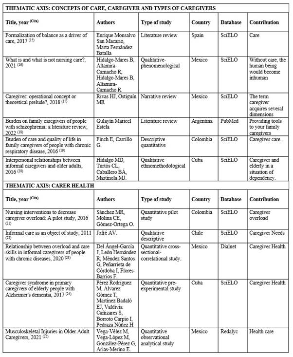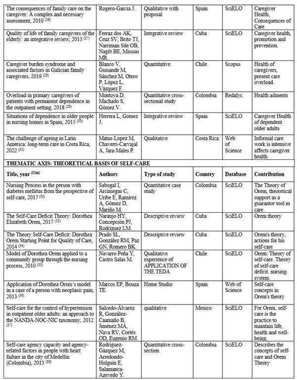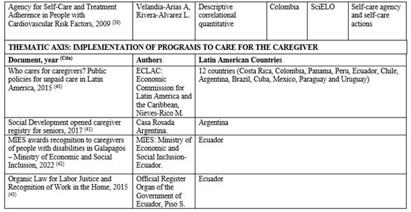 The 29 documents reviewed provided 4 thematic axis: 1) Concepts of care, caregiver and types of caregivers (6 articles); 2) the health of the informal caregiver (11 articles); 3) theoretical principles of self-care (8 articles) and 4) implementation of programs, projects and specific legislation to care for the caregiver in 12 Latin American countries (4 documents). The characteristics of the articles are presented in Table 1 T1a T1b.