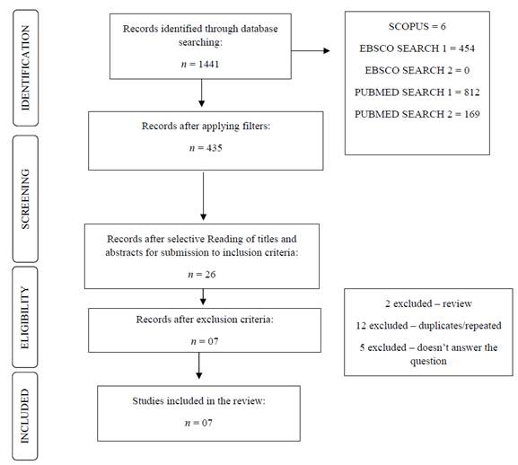 In the general search, a total of 1441 articles were found, which after applying the full-text filters freely available and published in the last five years, obtained the quantity of 435 articles, which went through the reading of title and abstract to apply the inclusion criteria. After reading the titles and abstracts, 26 studies were included for full reading, of which 7 are part of this review and were analyzed qualitatively. F1