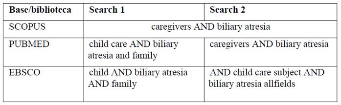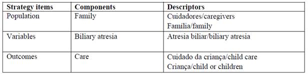 For the guiding question elaboration, PVO (Population, Variables and Outcomes) strategy was used, being thus, discriminated: population - family members; variables - biliary atresia; outcome - health care. This strategy allowed the elaboration of the following guiding question: “What is the knowledge produced about the impact of biliary atresia on the child and the family?”. The Table 1 summarizes how descriptors were identified from PVO strategy.
