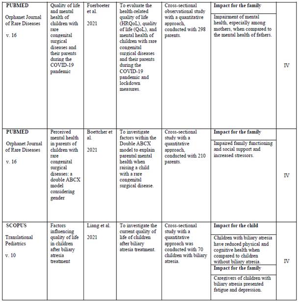This is an integrative review of literature carried out between July and September 2022, using databases and libraries: SCOPUS, PUBMED, and EBSCO. The descriptors for the search were adjusted according to the database or library, being caregivers, “biliary atresia”, “child care”, family, child, “child care subject”, combined with the boolean operator AND. The studies were selected in a careful and systematic way and evaluated for the level of evidence.
