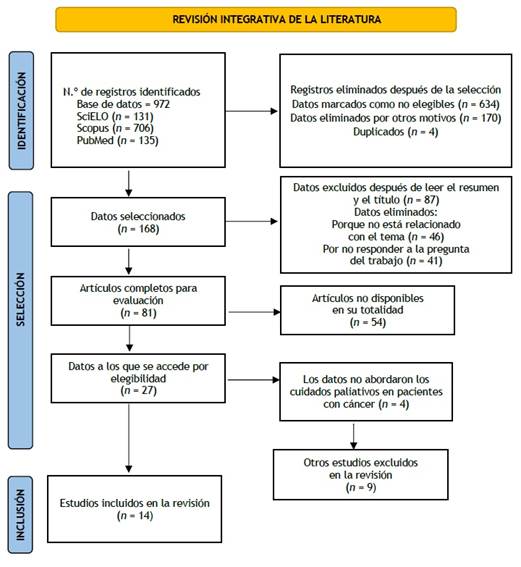 Teniendo en cuenta los criterios de inclusión y exclusión establecidos, se decidió no aplicar listas de verificación específicas para evaluar la calidad metodológica y/o el nivel de evidencia de los estudios seleccionados. Asimismo, se decidió no establecer un plazo para la búsqueda, a fin de no restringir o limitar el alcance de los hallazgos. El objetivo principal de estas decisiones metodológicas fue permitir la inclusión de la mayor cantidad posible de publicaciones relevantes sobre el tema, favoreciendo un análisis más amplio y profundo de las prácticas integrativas y complementarias en el contexto de la atención oncológica paliativa, y contribuyendo a la construcción de un marco teórico consistente en la revisión.