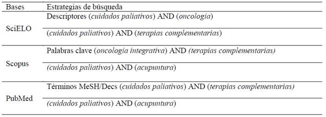 Se utilizó la estrategia PICO (población, intervención, comparación y resultados/desenlace). La búsqueda se realizó de julio a septiembre de 2024 en SciELO, Scopus y PubMed, con los descriptores cuidados paliativos, oncología, terapias complementarias, oncología integrativa, acupuntura y operador AND