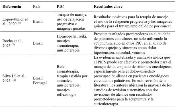 Esta revisión integrativa permitió identificar las prácticas de salud integrativa y complementaria (PIC) aplicadas con mayor frecuencia en el contexto de los cuidados oncológicos paliativos, como la acupuntura, la aromaterapia, el reiki, la musicoterapia y los masajes terapéuticos. Tales prácticas se han consolidado como estrategias relevantes para el manejo de los síntomas físicos y emocionales en pacientes con enfermedades avanzadas y sin posibilidad de curación. 5,7,12,24,25