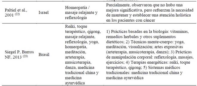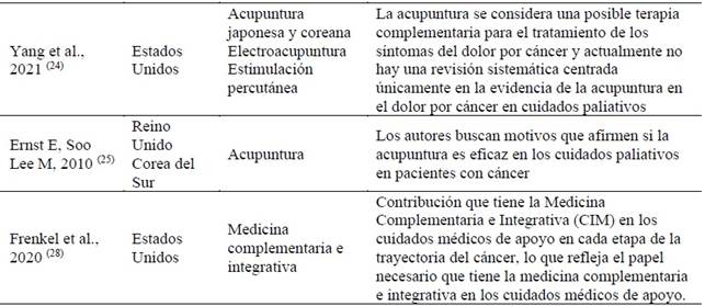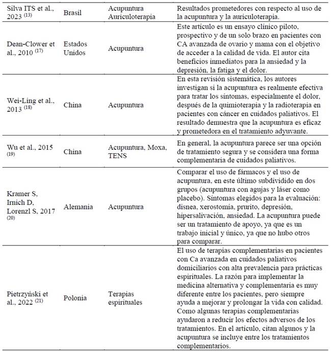 Finalmente, el uso de aceites esenciales, terapias asistidas por animales y medicina complementaria integrativa se mencionaron de forma aislada en un estudio cada uno. Aun así, estas intervenciones han demostrado efectos positivos en la atención de pacientes con cáncer en un contexto paliativo. 12,15,16) En la Tabla 2 . . . se pueden ver los principales resultados de cada referencia.