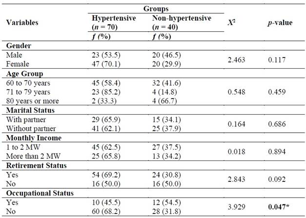 In comparing the proportions of hypertensive and non-hypertensive older individuals based on sociodemographic variables (Table 1), a significant difference was found between the groups only in occupational status (p = 0.047). This difference indicates a higher proportion of older individuals who do not have an active occupational status and are hypertensive.