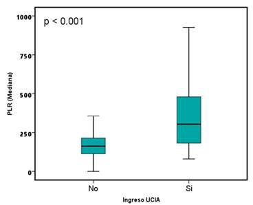 Gráfica 2: Comparación del índice Plaqueta/Linfocito (PLR) entre pacientes que no requirieron ingreso a la Unidad Cuidados Intensivos (UCI) y aquellos que sí lo hicieron.