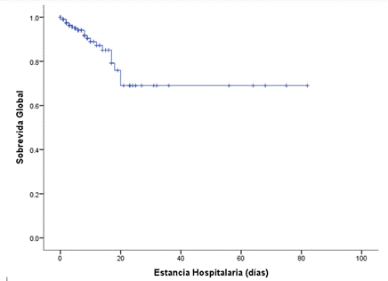 De la cohorte analizada, 42 pacientes (20.1%) requirieron UCI, con predominio masculino, 30 (71.4%) hombres y 12 (38.6%) mujeres. La mediana de edad fue 65 años (rango 36-87). La mediana de estancia en UCI fue 10 días (rango 1-81). La mediana de días ingresados previo a requerir ser trasladados a UCI fue de 3 días (rango 1-21). La mediana de sobrevida en UCI fue de 32 días. (Gráfico 3)
