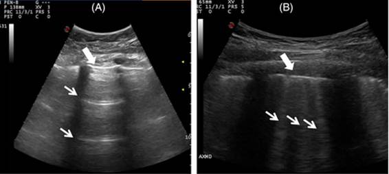 Figura 1: Ecografía Pulmonar: Características ecográficas de pulmón normal y de enfermedad pulmonar intersticial (EPI). (A): Pulmón normal, líneas A (líneas horizontales regulares). (B) Imagen de un pulmón con afectación pulmonar fibrótica, evidencia de líneas B; a su vez se observa pleura irregular. Tomado de: Otaola M, et al 16