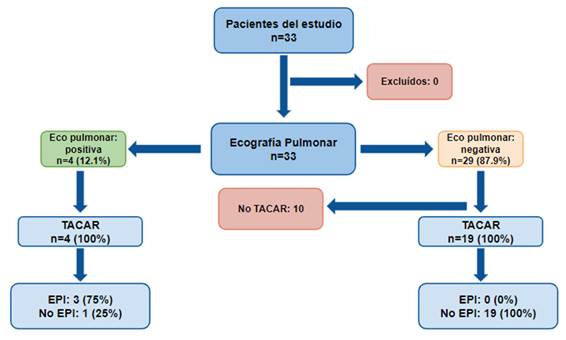 Se realizó ecografía pulmonar a todos los pacientes del estudio (n=33). 4 pacientes (12.1%) presentaron ecografía pulmonar positiva. Entre ellos, 3 mostraron una TACAR que confirmó el diagnóstico de EPI, mientras que 1 paciente evidenció bronquiectasias. En el grupo con ecografía pulmonar negativa, 10 pacientes no contaban con TCAR (Figura 2).