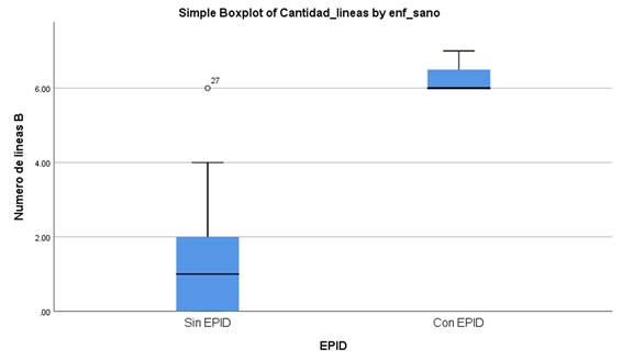Cuando se comparó el número de líneas B con la presencia o no de EPI, se encontraron diferencias en las medianas de pacientes con EPI y pacientes sin EPI. Mediana de pacientes sin EPI: 1,0. Mediana de pacientes con EPI: 6,0 (p = 0.004). Test estadístico utilizado para la comparación de medianas Test Mann Whitney U Test. (Gráfico 1).