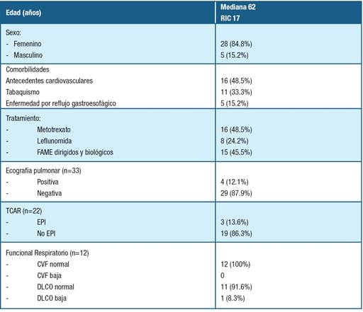 Se realizó funcional respiratorio a 12 pacientes (36%), solo 1 de ellos presentó DLCO descendida, siendo uno de los pacientes que presentó ecografía pulmonar positiva. La CVF fue normal en todos los pacientes.