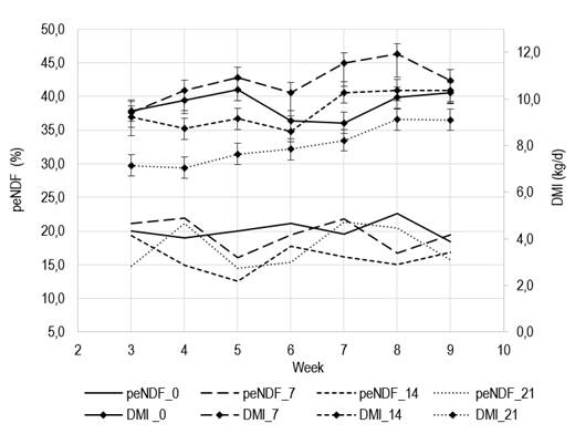 Figure 1: Effect of whole oat level (0, 7, 14 or 21%) as fiber source replacing grass hay on physically effective fiber intake (pendf), and weekly evolution of mean daily dry matter intake (dmi)