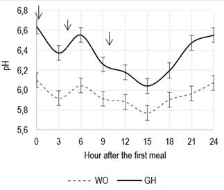 Figure 2: Daily evolution of ruminal pH in steers consuming a ration with grass hay (gh, 35% dry basis) or whole oats (wo, 35% dry basis) as fiber source (bars indicate standard error, and arrows feeding schedules)