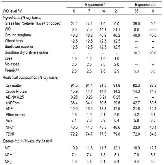 Two experiments were designed to characterize wo value as a source of fiber in concentrated diets for growing cattle. They aimed to assess the effect that the inclusion of wo has on growth and feed use efficiency, when replacing long fiber provided by hay (Experiment 1), and to characterize the ruminal fermentation pattern of the feed when long forage fiber is entirely replaced by wo (Experiment 2).