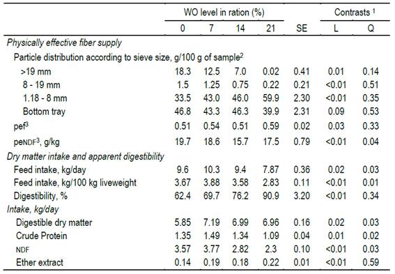 A positive linear response was observed between the dmd and the concentration of wo (dmd, %= 60.95 + 1.32x, R²= 0.96; Table 2) resulting in a quadratic increase of digestible dmi (ddmi, kg/d=0.007x2 + 0.19x + 5.94, R² x 0.87). Intakes of ndf and cp decreased quadratically (ndfi, kg/d=-0.004x2 + 0.009x + 3.65, R²= 0.91), while ether extract intake increased linearly (Table 2). The replacement of gh with wo did not affect the selection in the feeder, resulting in similar concentration of ndf between leftovers and offered feed (difference (ndf)ration-leftovers-0.4, 0.0, 0.1 and 0.4 percentage units, for WO at 0%, 7%, 14% and 21%, respectively).