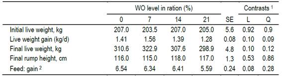 The wg was not significantly affected by the treatment (P=0.07), but showed a quadratic trend (P=0.09) increase (wg, kg/d= 1.43 + 0.02x - 0.0013x2, R2= 0.81), registering a maximum wg of 1.51 kg/d for a concentration of wo= 7.7%, from which the wg decreased, reaching for wo= 21% lower values than the control WO=0% (Table 3). However, no differences were detected in the final lw, nor in the rump height (P>0.10; Table 3). Feed conversion showed a trend (P = 0.08) to fall linearly (fc= 6.637 - 0.0397x, R2= 0.70).