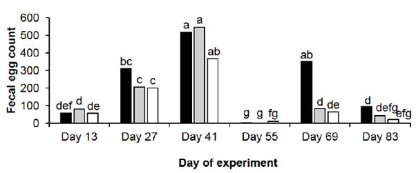 Figure 2: Faecal egg count according to nutritional treatment PN (), SGSM (), DDGS () and sampling date, with dosages at three times (Day 0, 50 and 78)