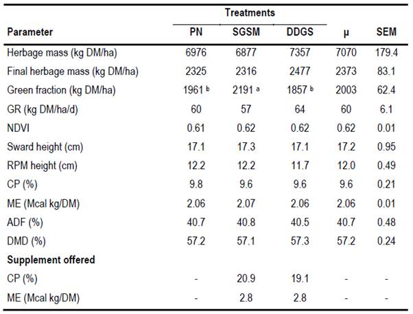Table 1: Means (μ ± SEM) of herbage mass, final herbage mass, green fraction, growth rate, normalized differentiated vegetation index, height determined by sward and Rising Plate Meter, and chemical composition of the forage and supplement offered for each nutritional treatment (PN, SGSM, DDGS)