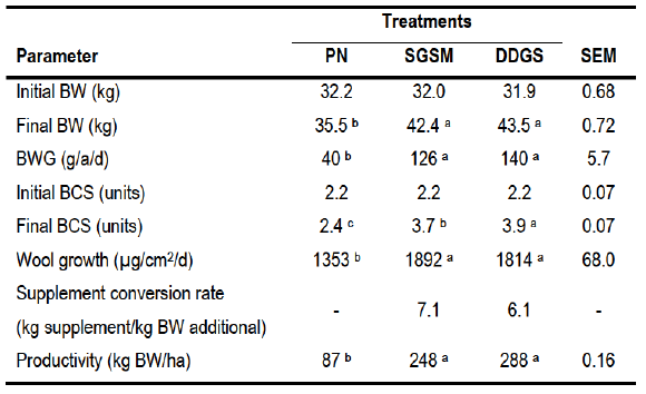 Table 2: Means (± SEM) of initial and final body weight, body weight gain, initial and final body condition score, wool growth, supplement conversion rate, productivity of body weight per hectare for each nutritional treatment (PN, SGSM, DDGS)