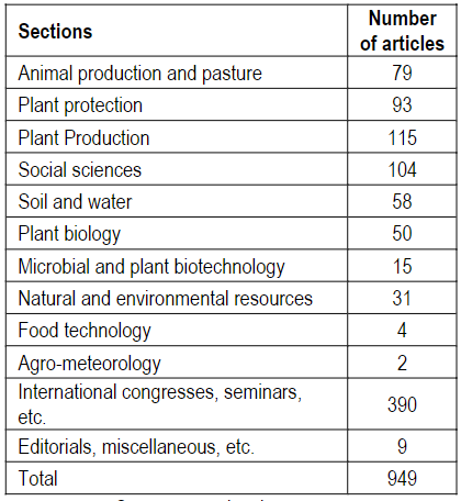 From volume 7 number 1 of 2003 the magazine was divided into sections. The first sections were Animal Production and Pastures, Plant Protection, Plant Production, Social Sciences (which, from vol. 19, No. 1 of 2015 was renamed as Social Sciences and Agrarian Economics, and, from vol. 23, No. 1, 2019, Social Sciences, Rural Sociology and Agrarian Economics), Soils, and Water and Plant Biology. In Vol. 21, No. 1 of 2017 two new sections were created: Natural and Environmental Resources, and Plant and Microbial Biotechnology. In vol. 23, No. 1 of 2019, the new section Natural and Environmental Resources and an editorial dedicated to general problems were inaugurated, although this last section was published occasionally, while in vol. 25, No. 1 of 2021, the Forest Sciences and Landscape Management section was introduced. Previously, in vol. 10, No. 1 of 2006, an article had been published for an Agro-Meteorology section, but it was not repeated. In the first issues, sections dedicated to miscellaneous or reviews were published that were not continued.