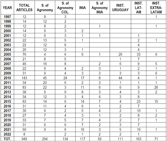 Something similar happens with institutions linked to the agricultural sector, although to a lesser extent, since publications, individually or in collaboration with researchers from the School, scholars from the Ministry of Livestock and Fisheries, the Agricultural Plan Institute, the Clemente Estable Research Institute, the National Institute of Viticulture (INAVI), the Uruguayan Wool Secretariat and other private bodies, are much more frequent and appear independently of the publication of the minutes of congresses, particularly in the case of INAVI. Despite the fact that, as stated, the first collaboration of an INIA researcher dates back to 1999, since the institution assumed co-responsibility for the publication of the journal in 2006, there has been a constant increase in collaborations of INIA researchers and, since 2010, a representative number of articles reporting on research carried out by INIA and faculty scholars.
