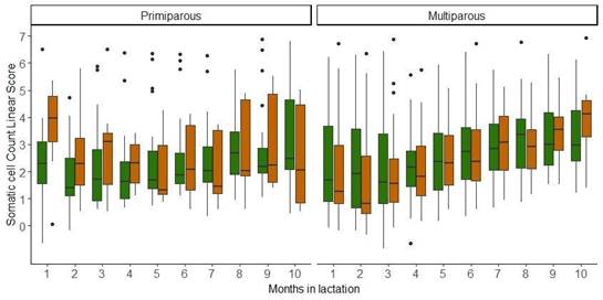 Figure 2: Descriptive statistics for the evolution of somatic cell count linear score of two Holstein-Friesian strains (North American = green, New Zealand = brown) by parity (primiparous and multiparous) and months in lactation