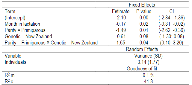 In both models, strains (NZ or NA), time (months of lactation) feeding strategies (Grass Maximum or Grass Fixed) and parity (primiparous or multiparous) were fitted as fixed effects, and cows as random intercepts. Model goodness of fit was assessed by the calculation of marginal (R2m) and conditional (R2c) coefficient of determination for Generalized mixed-effect models. The α values for all statistical tests were assumed to be significant when <0.05. For both models, the variable selection was performed through Akaike Information Criterion (AIC), and the results are presented according to the optimal selected model.