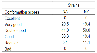 Table 2: Percentage of cows with different udder conformation scores (excellent, very good, double good, good, regular, bad) of two Holstein-Friesian strains (North American: NA, and New Zealand: NZ)