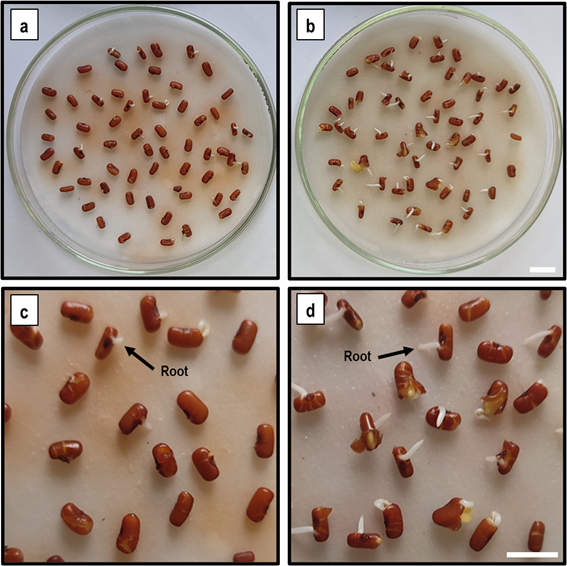 | Time required for germination of 50% of the seeds (days) | 3.5 ± 0.12 (a) | 0.83 ± 0.04 (b) |