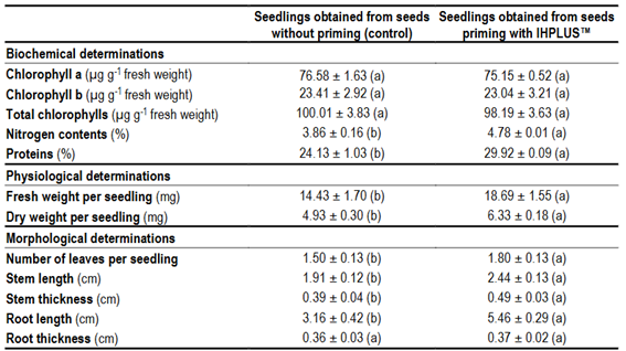 The content of chlorophyll a, b and total 14 days after sowing the seeds did not show significant differences between the treatments evaluated (Table 3). However, the content of total nitrogen and total protein, in the same period of time, increased significantly in the aerial part (leaves and stems) of the seedlings obtained from seeds priming with IHPLUSTM. Likewise, fresh and dry mass, the number of leaves per plant, the length and thickness of the stem, and the length and thickness of the root increased significantly in the seedlings obtained from seeds priming with IHPLUSTM after 14 days of cultivation (Table 3).