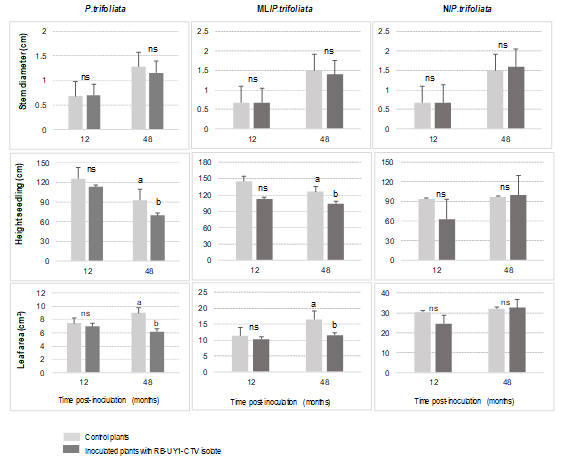 Figure 1: Growth parameters evaluated in P. trifoliata seedlings, ML/P. trifoliata, and N/P. trifoliata at 12 and 48 months post-inoculation with RB-UY1-CTV isolate